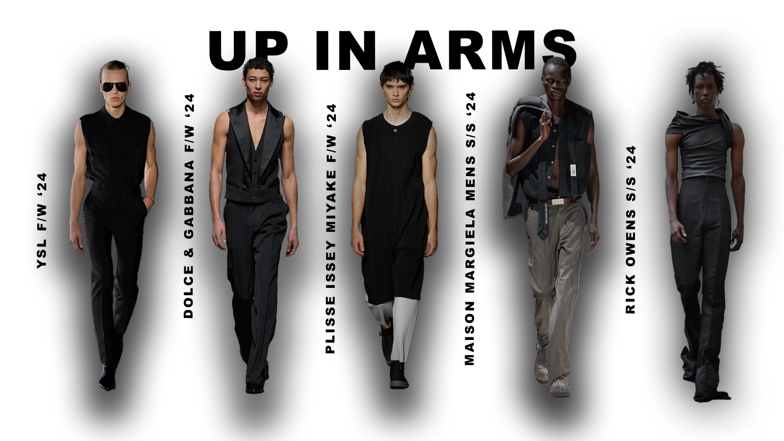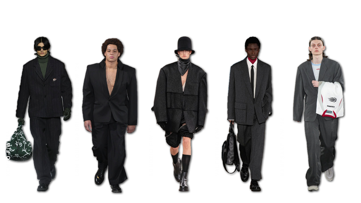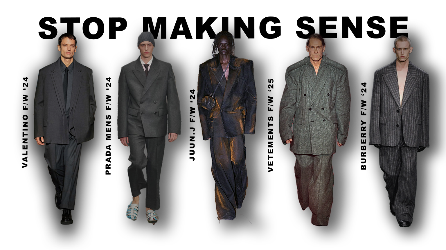 Recent menswear runways signal a shift toward bold proportions and unconventional tailoring. “Up in Arms” showcases the rise of sleeveless tailoring and sculpted upper-body silhouettes, emphasizing sharper, body-focused shapes. “Stop Making Sense” highlights oversized suiting and distorted proportions across major houses, pushing menswear toward exaggerated volume and experimental form. Together, these looks reinforce our forecast: designers are redefining classic tailoring through dramatic shape, scale, and attitude.