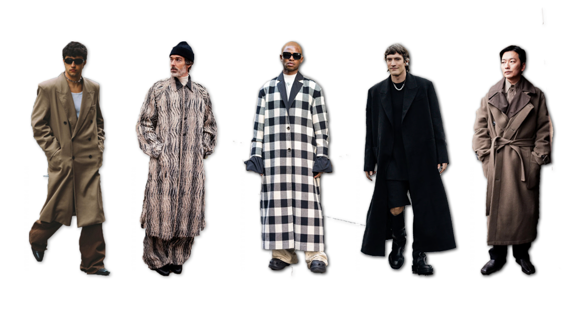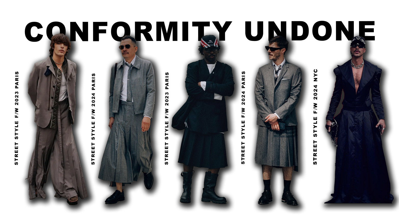 Street style confirms menswear’s shift toward expressive, unconventional proportions. “Conformity Undone” shows wide-leg tailoring and skirted silhouettes that break from traditional structure, while “What Are You Hiding?” highlights long coats and oversized layers that create anonymity and dramatic volume. Together, these looks show real-world adoption of the exaggerated shapes and anti-uniform attitudes driving our forecast.