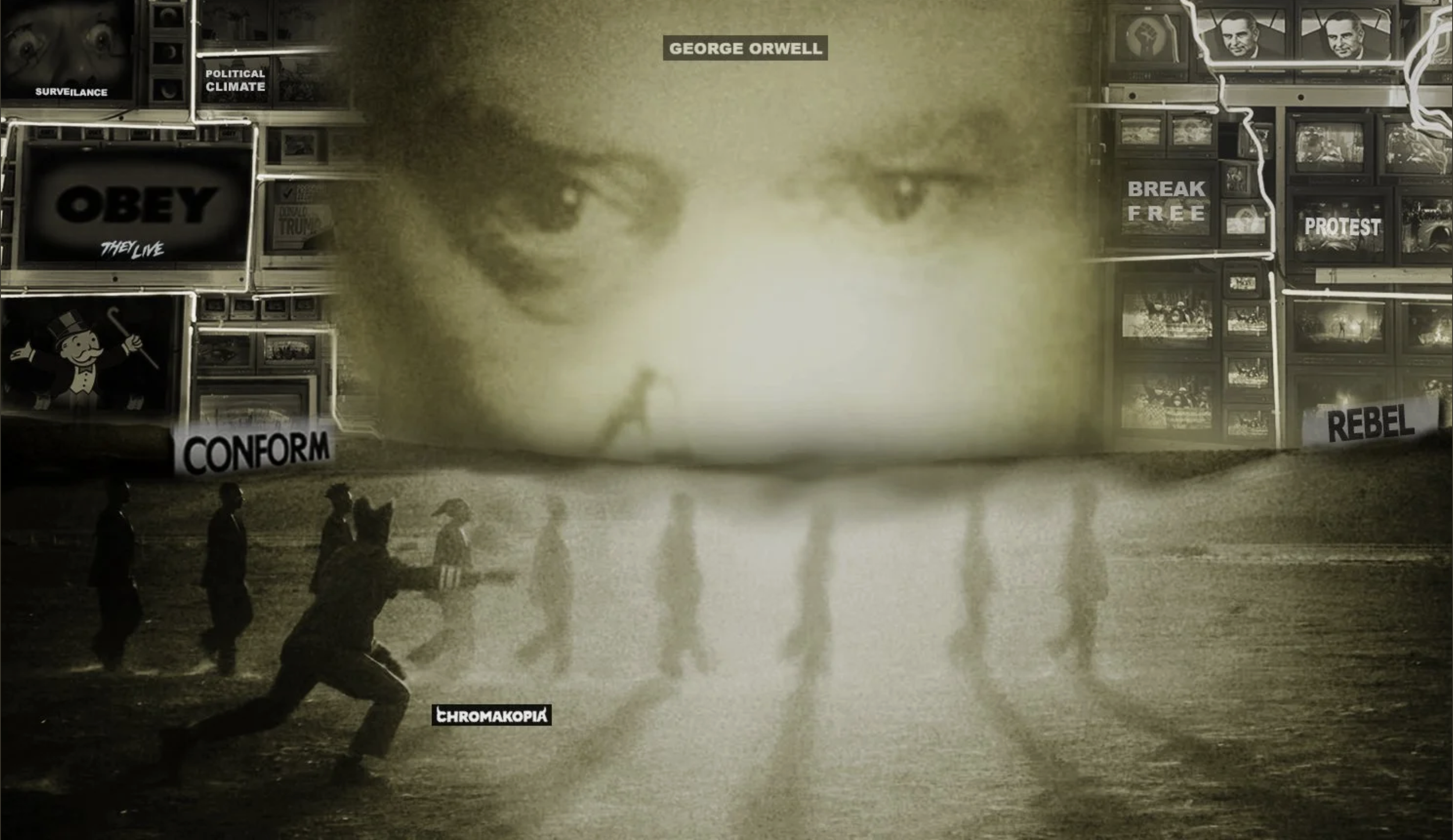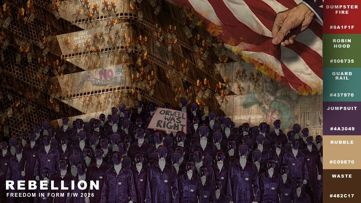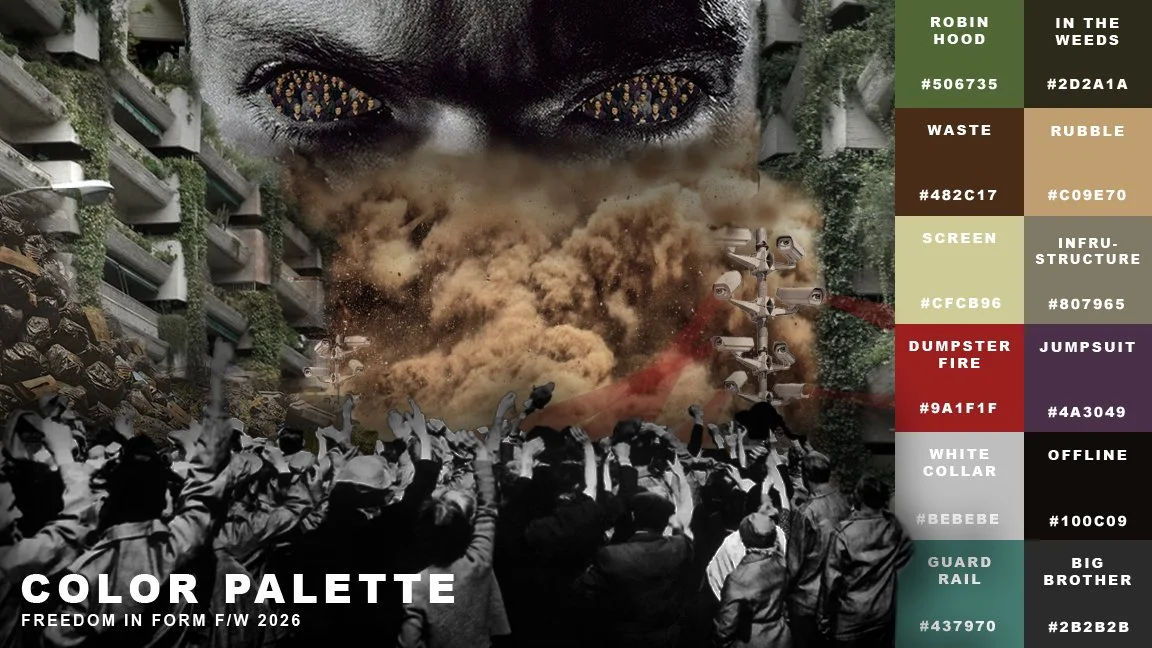 Our forecast imagines a world where conformity and rebellion coexist. Silhouettes follow Tyler, the Creator’s St. Chroma across a barren landscape, choosing between “Conform” and “Rebel” in a corporate-driven society. Above them, imagery inspired by They Live, the Monopoly Man, and Big Brother represents surveillance and control, while scenes of protest signal the fight to reclaim identity within an increasingly homogenized world.